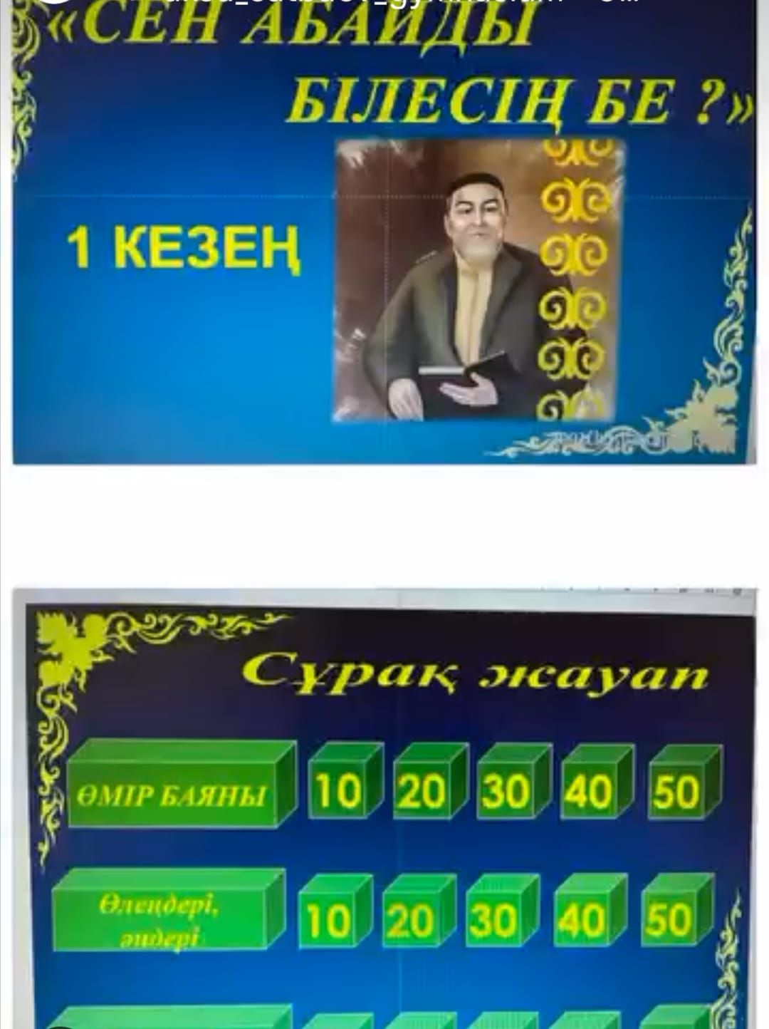 Данышпан, дара, ойшыл ғұламалардың бірі Абай Құнанбайұлының 180 жылдығына орай 8-ші сынып оқушыларымен "Білімділер әлемі" әдеби ойыны өткізілді. Ұлы Абайдың туған кезеңінен бастап, білім ізденген жастық шағы, отбасы, шығармашылығы туралы сұрақтарға жауап беру арқылы оқушылар білімдерін толықтырды.
