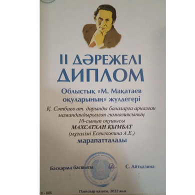 Гимназиямызда жыл бойы балалардың дамуы мен шығармашылық, танымдық әлеуетін арттыруға бағытталған шаралар ұйымдастырылды. Жыл соңында гимназия директоры А.Дюсембаев, "жүзден жүйрік, мыңнан тұлпар" шыққан балаларды дипломмен, сыйлықтармен марапаттап, барлық шараларды қорытындылады.