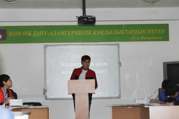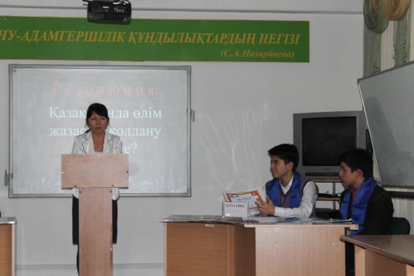 11 желтоқсан күні гимназияда мектепішілік пікірсайыс өтті. Жаяу Мұса атындағы колледж студенттері: Бахтияр Нұртас, Магауов Жаңылбек, Гибратова Жанерке және 11-сынып оқушылары Қайыржан Санжар, Искакова Мадина қатысып, ойынға төрешілік етті. Көрермендер жоғарғы сынып оқушылары және колледж студенттері болды. 8-9 сынып оқушыларынан құрылған «Ақиқат» тобы мен «Жасөркен» топтары арасында болған пікірсайыстың қарары: «Қазақстанда өлім жазасын қолдану қажет пе?» деп аталды. Пікірсайысымыз еліміздің тәуелсіздік мерекесінің қарсаңында ұйымдастырылды. Тәуелсіздігіміз мызғымас, берік болуы үшін еліміздің ішкі сыртқы саясаты, экономикасы, сонымен қатар құқықтық жүйесі де берік болуы керек. Бүгінгі таңда барлығымызға да жаңалық емес еліміздегі ең өзекті мәселелердің бірі - ол қылмыстың санының өсуі, қылмыстың түрлерінің артуы болып отыр. Осы мәселемен күресу үшін не істеуіміз керек? деген сұрақ отанымыздың әрбір азаматын ойлануы тиіс. Пікірсайысқа қатысқан оқушылар да студенттер де осы тақырып бойынша өз ойларын ортаға салды, өз пікірлерін дәлелдеуге тырысты. Пікірсайыстың көрермендері де осы тақырып бойынша ортаға шығып өз пікірлерін айтып, белсенділік танытты. Пікірсайыстың жеңімпаз тобына, үздік спикерлерге сертификаттар берілді. Қаламыздағы Жаяу Мұса атындағы колледждің студенттерінен құрылған пікірсайыс топтарымен алдағы уақытта да байланысымыз жалғаса береді деп ойлаймыз.