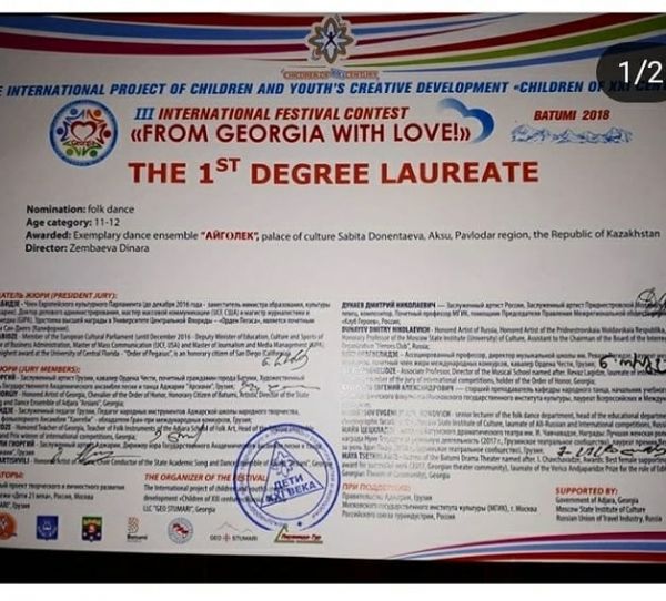 Үлгілі "Айгөлек" би ансамбілі 29.06.-01.07.аралығында Грузия мемлекетінің Батуми қаласында өткен ІІІ Халықаралық "ГРУЗИЯДАН МАХАББАТПЕН" фестиваль-байқауына қатысып, бірнеше категорияда жүлделі І орынға ие болды.10 мемлекеттен келген 75 ұжымның арасынан суырылып шығып, Қазақстанның, облысымыздың намысын қорғап, биік шыңнан көрінуі - сөзсіз, шығармашыл да, талантты жетекшінің еңбегі. Ол Динара Негматуловна Зембаева. "Айгөлек" ансамбілін және олардың жетекшісін керемет жеңістеріңмен құттықтаймыз!